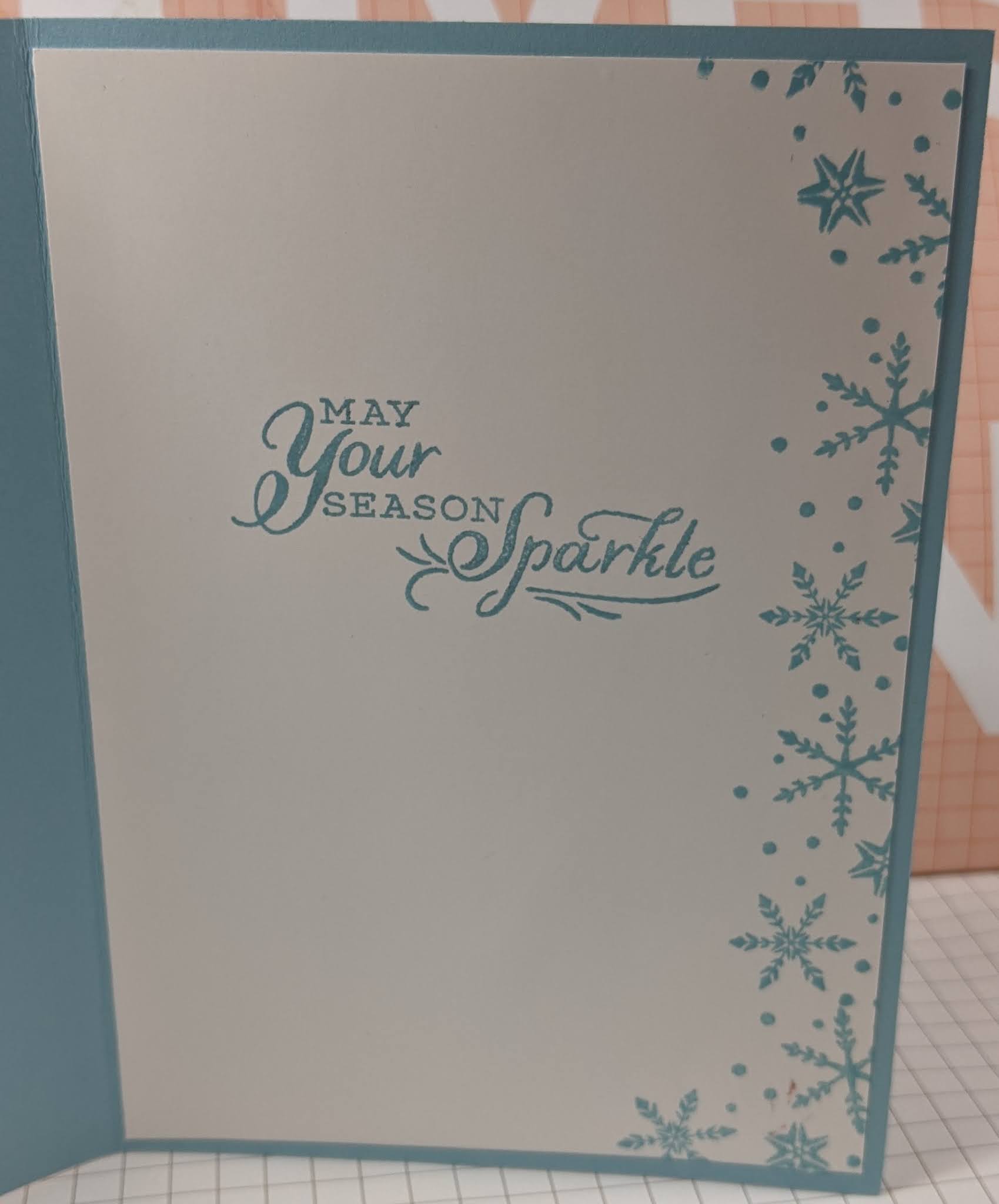 The first is on the left in the picture, I cut pieces of double sided paper to match both colours of card, in this case a Pool Party (pale green) mat on a white card base and the other on the right is on a Balmy Blue, (a pale blue) card base. The papers are both from the matching suite as the snowflakes and they are called Snowflake Splendour. These papers are in beautiful shades of light and dark blues, pale and darker greens and a lovely shade of lilac and purple through to pink tones. Gorgeous!