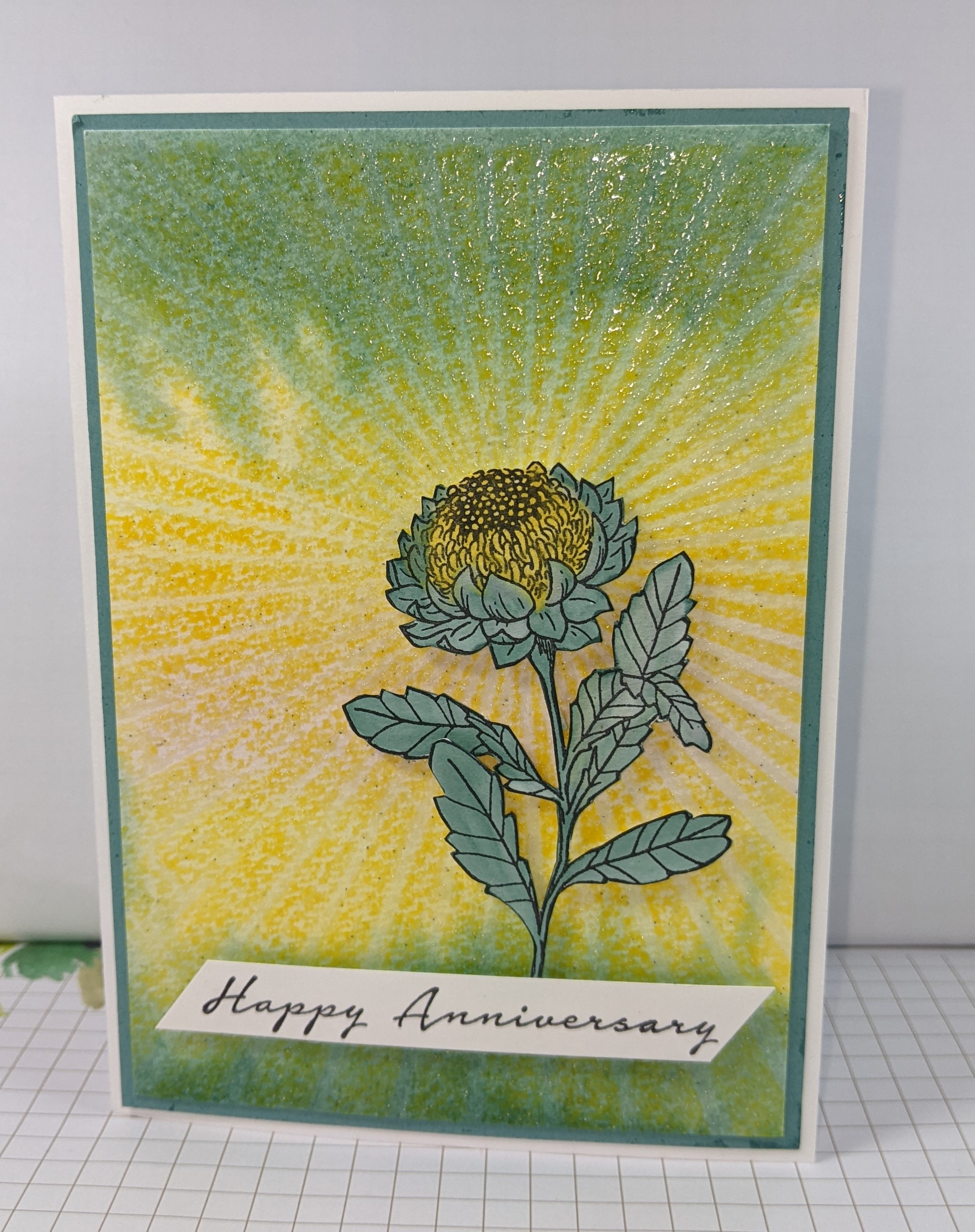 Hello again. Firstly, I must apologise for the lack of a project for yesterday. Unfortunately, life just got in the way! I'm very sorry. However, today's project is another background stamp that I have wanted to use for a while but have never gotten around to it. I started by spritzing a piece of Fluid watercolour paper with lots of water. Using an H block, I inked it up with first of all a beautiful very soft pink called Bubble Bath. I spritzed that with water too and added it across the centre of the piece of watercolour paper. I repeated this process with the fresh lemon of Lemon Lolly, above and below of the pink and then the blueish green of Lost Lagoon above and below of the lemon. I tilted the card quite a bit to blend the colours well and got the lovely misty lines. Then using the Rays of Light stamp, I inked it with Versamark and then some Lemon Lolly and placed it over the now dry mat.